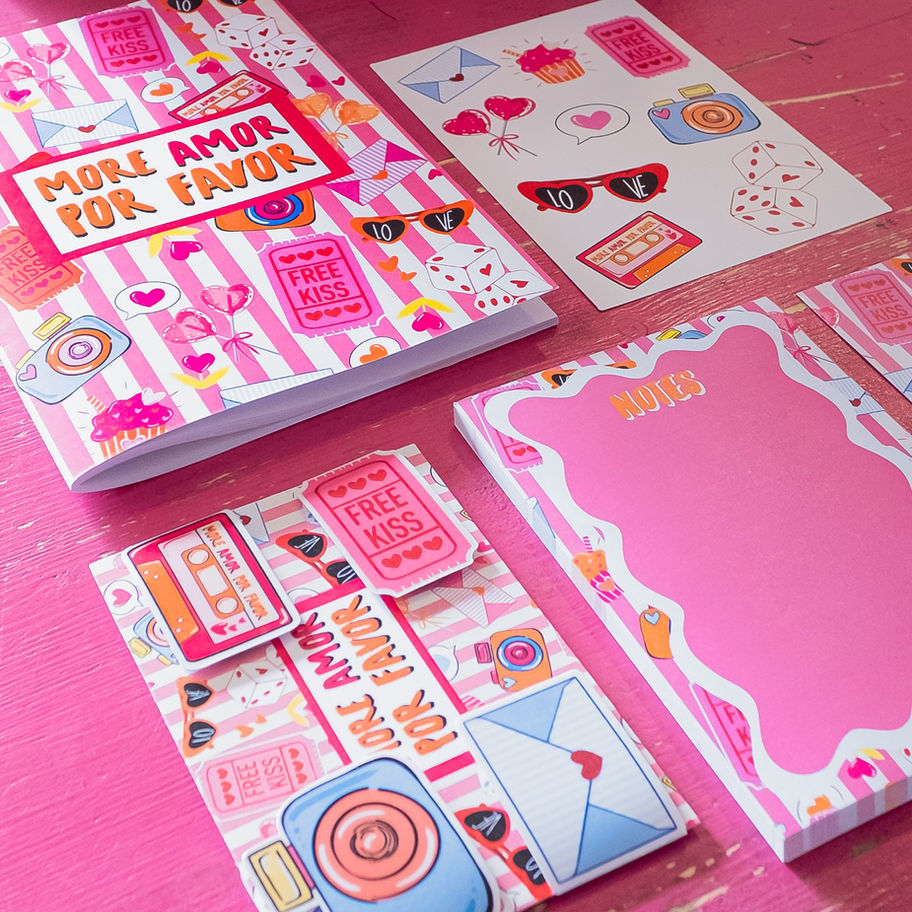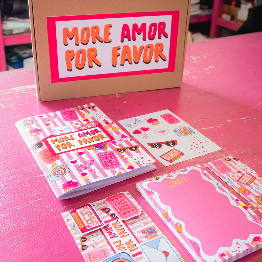 MORE AMOR POR FAVOR è un kit che nasce dal cuore dello Scarabocchio. E' la prima collezione ideata, firmata e prodotta dallo Scarabocchio e disegnata interamente e appositamente per il progetto da Francesca Magi. Il Design strizza l'occhio agli anni '90, i colori e gli elementi raccontano ricordi di una adolescenza spensierata, oggetti che riaffiorano nella nostra mente e ci riportano indietro nel tempo. Toni vivaci e brillanti sottolineano ed enfatizzano il messaggio "più amore per favore", un vero inno alla bellezza e alla purezza dei sentimenti.