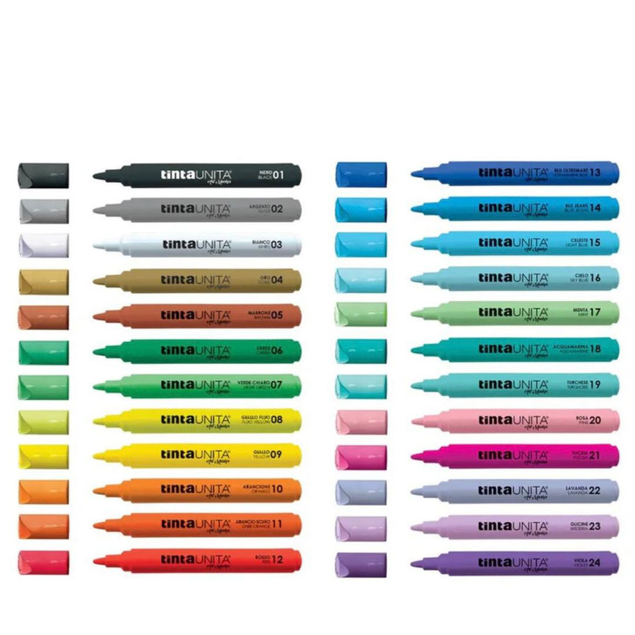 I marker acrilici Tinta Unita uniscono 24 colori brillanti e coprenti con la possibilità di scrivere e colorare su tutte le superfici: plastica, vetro, tessuto, ceramica, legno e carta. La punta resistente garantisce tratti precisi e duraturi, ideali per creatività, studio e fai-da-te.