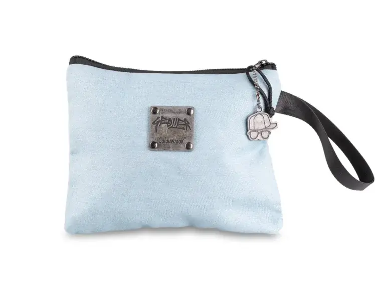 La pochette ha la placchetta in lega metallica che riporta il logo Geolier in rilievo sul fronte mentre la chiusura del tirazip con cordoncino è accompagnata dalla placchetta pendente con cappello e occhiali incisi. La chiusura principale è a zip e ha una comoda maniglia laterale per agevolare l’ergonomia